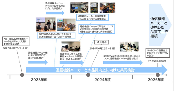 NTT East and West recognize that in order to provide stable communications services, they need to strengthen their collaboration with communications equipment manufacturers more than ever before and make efforts to identify potential equipment malfunctions. They have concluded an MOU and are strengthening their collaboration with the aim of building a system to shorten the time it takes to restore service in the event of a failure.