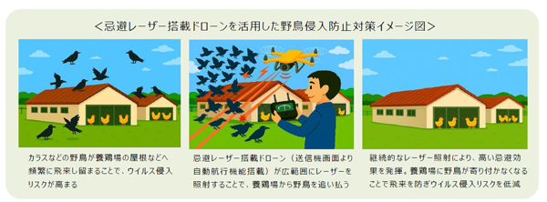 NTT East Chiba and NTT e-Drone, in collaboration with Chiba Prefecture, have been utilizing advanced technologies such as repellent lasers and drones to prevent the outbreak and spread of avian influenza at poultry farms operated by poultry farmers in the prefecture since mid-October.