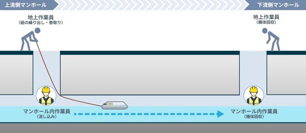Japan Infrastructure Waymark Improving the efficiency of small-diameter sewer pipe inspections using a float boat.
