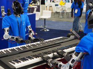 The humanoid robot demonstrated playing the piano, demonstrating its precision and dexterity.)